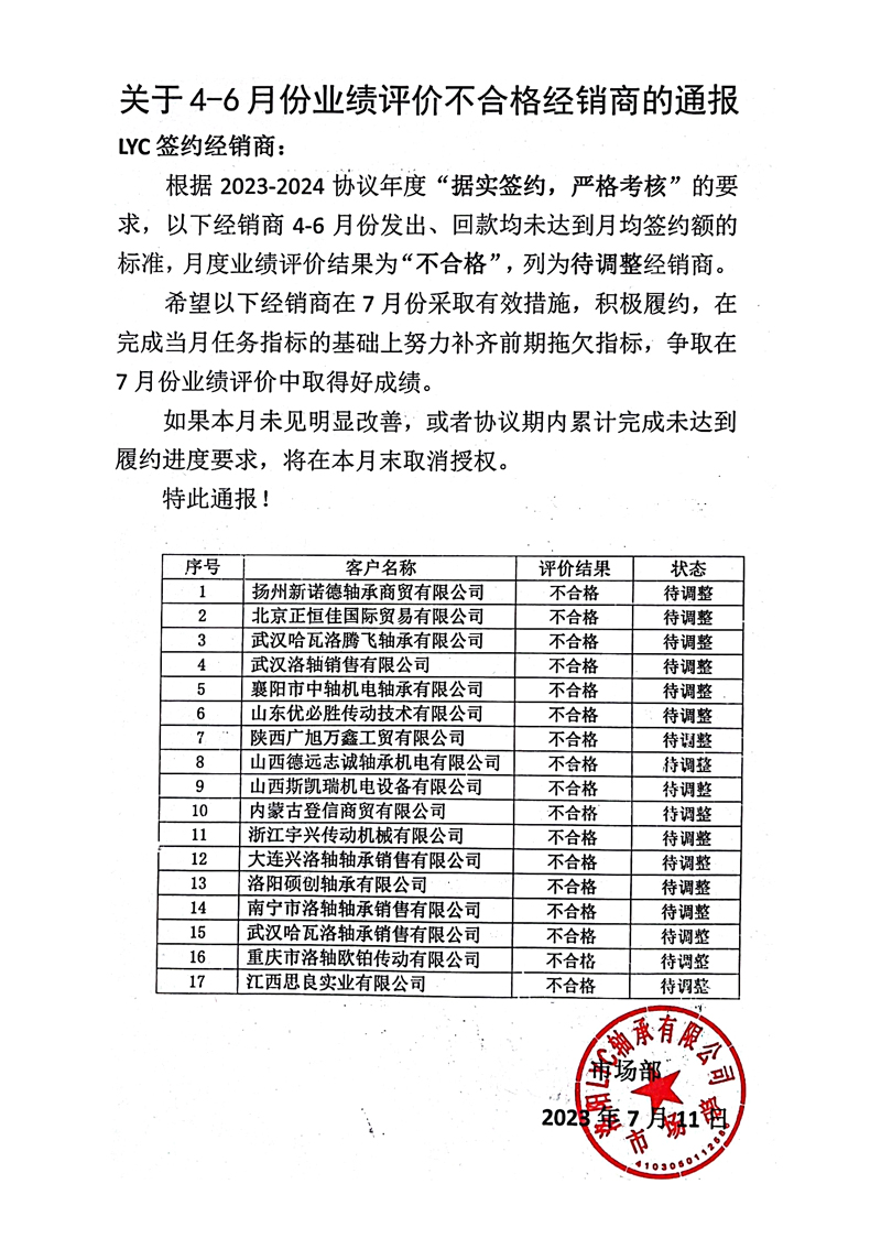 關于4-6月份業績評價不合格經(jīng)銷商的通報