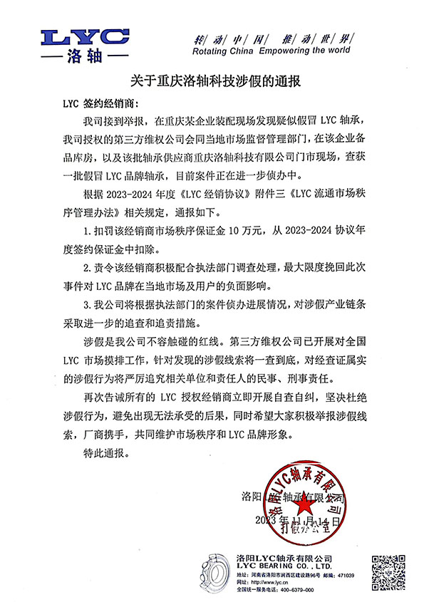 關于重慶洛軸科技涉假的通報