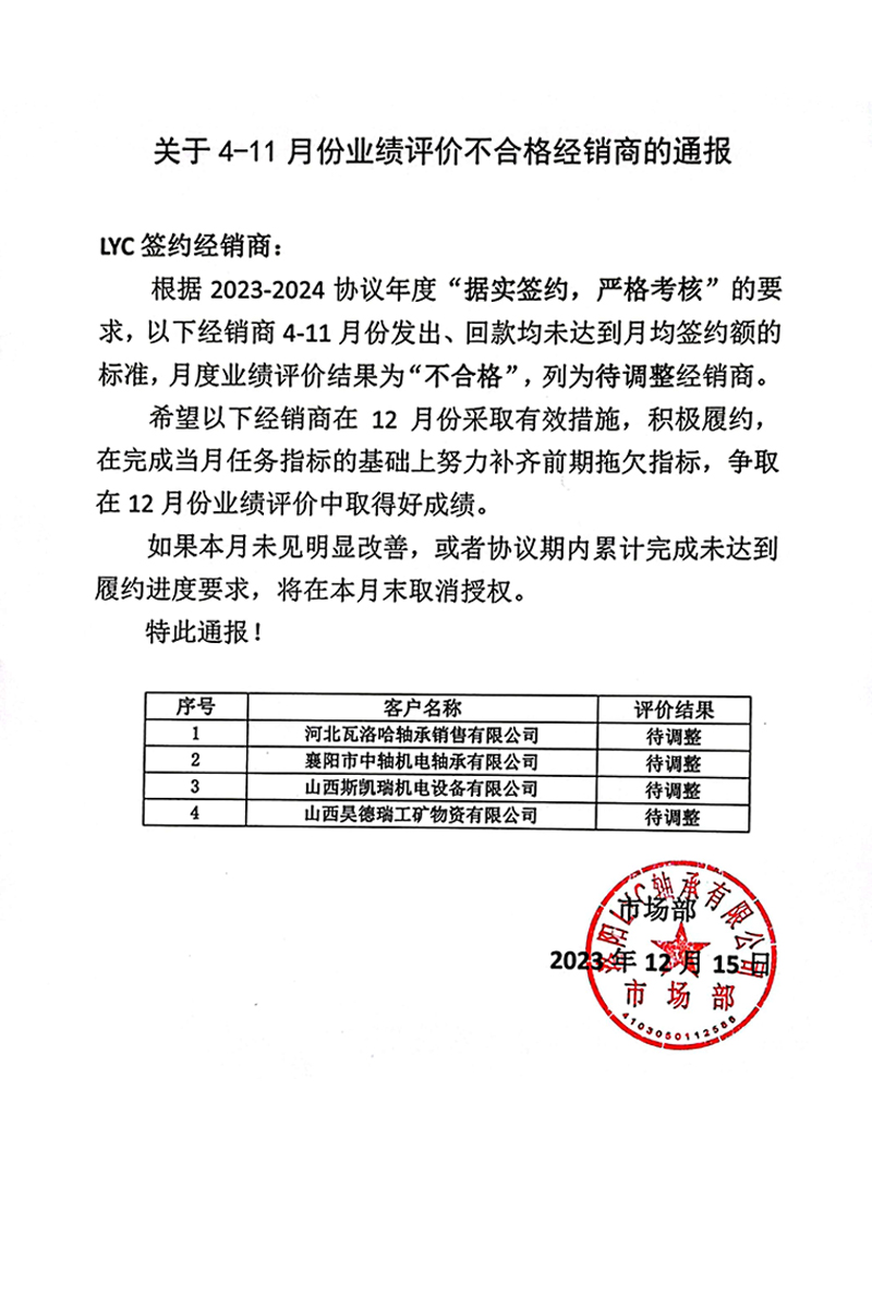 關于4-11月份業績評價不合格經(jīng)銷商的通報