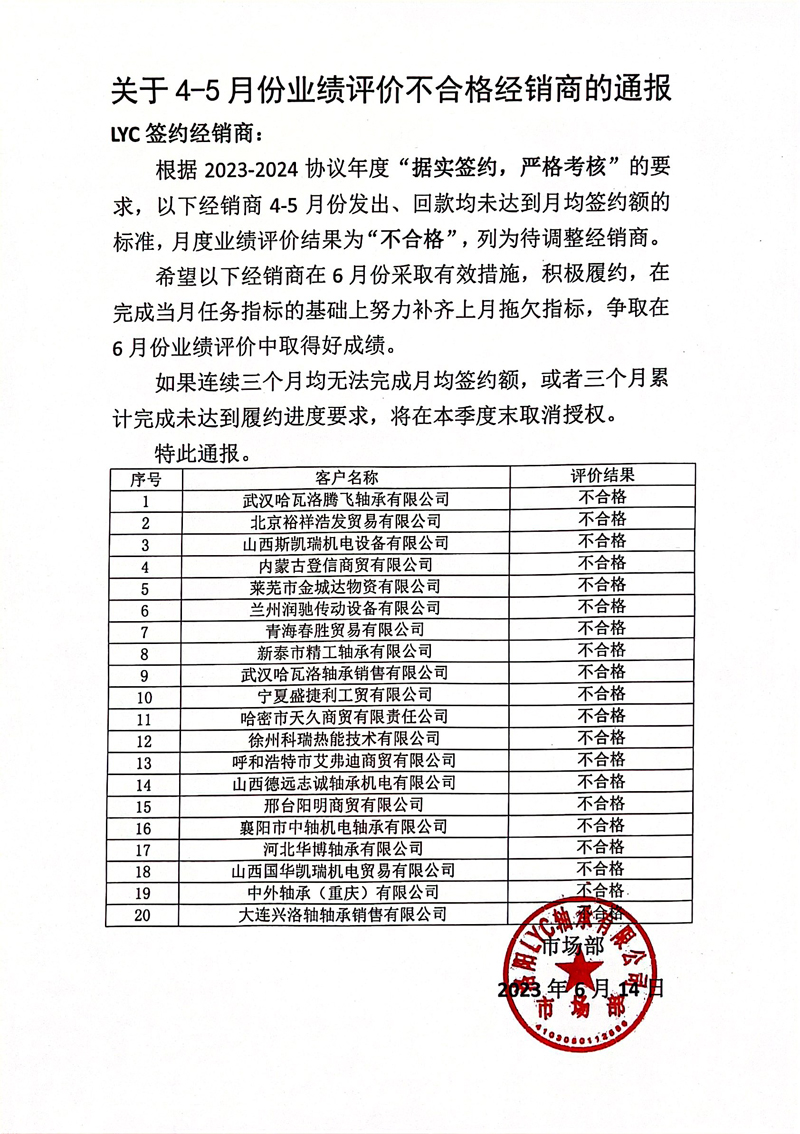關于4-5月份業績評價不合格經(jīng)銷商的通報